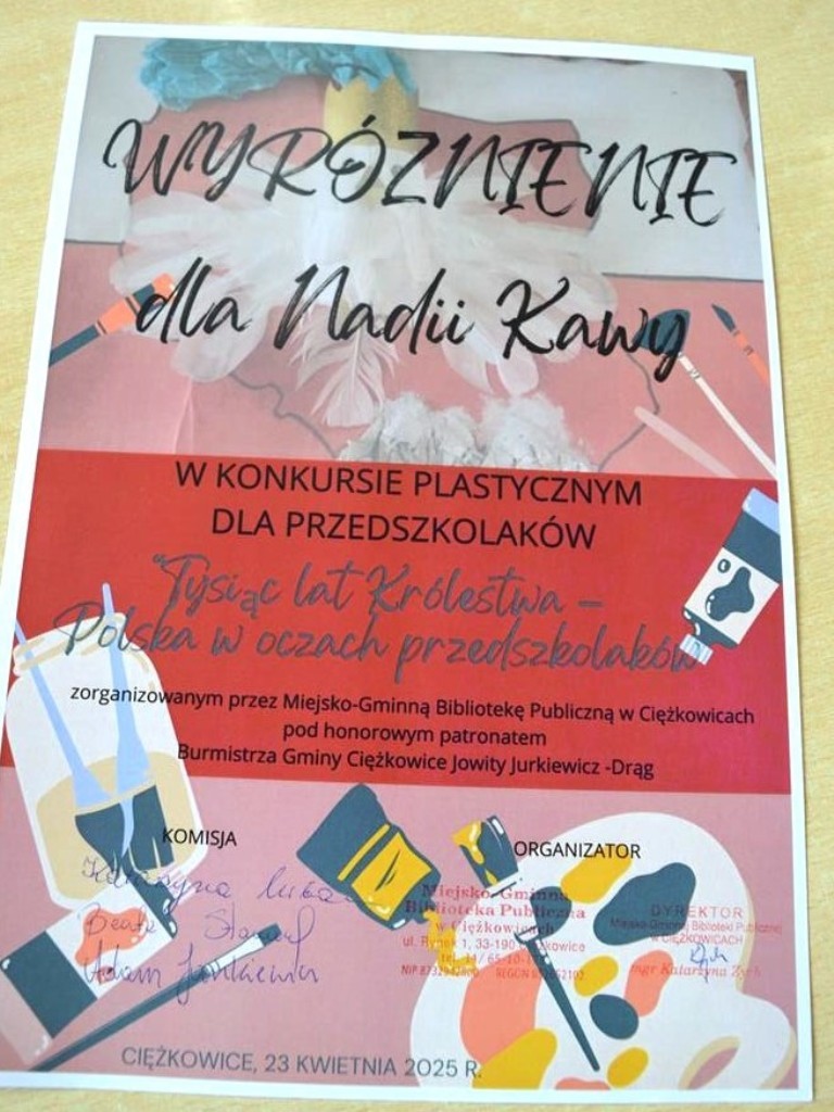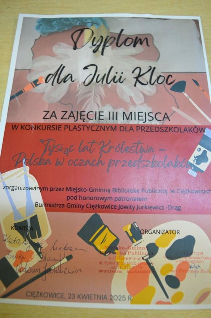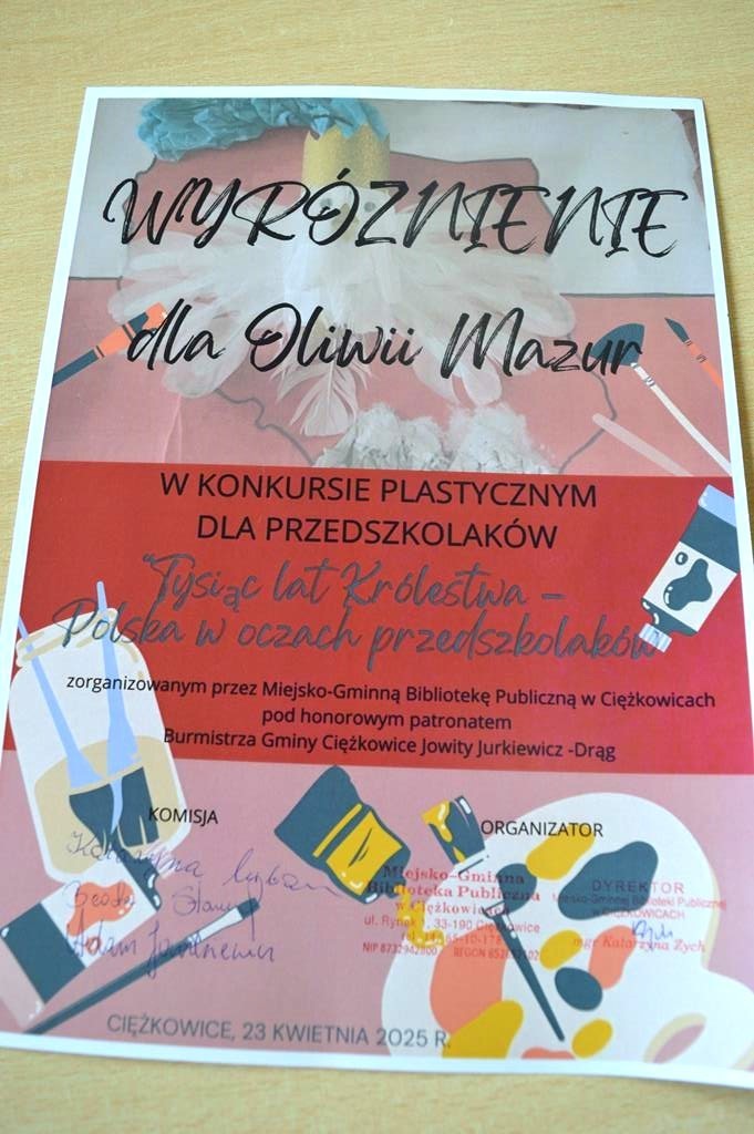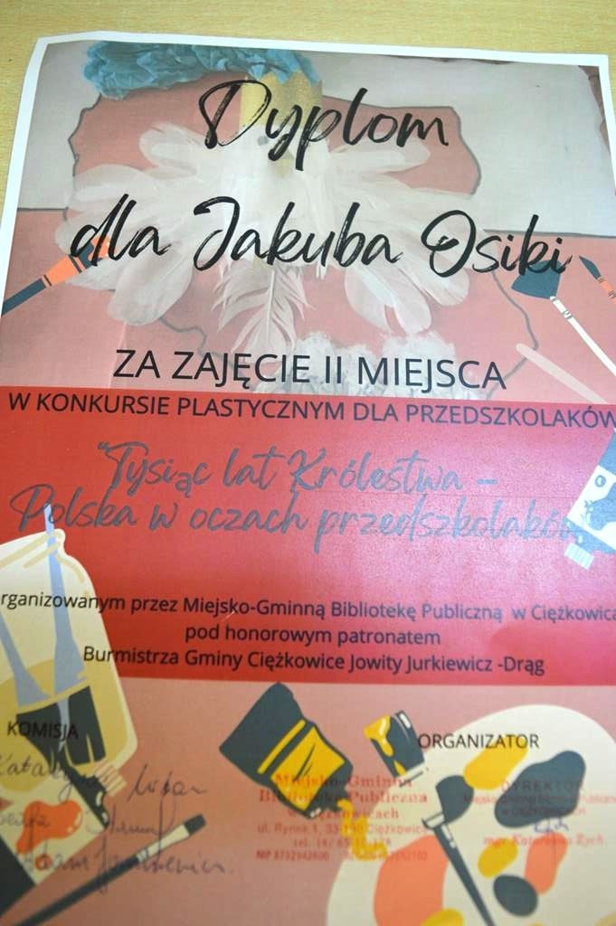 I, II oraz III miejsce w konkursie pt. „Tysiąc lat Królestwa – Polska w oczach przedszkolaków” 23 kwietnia 2025